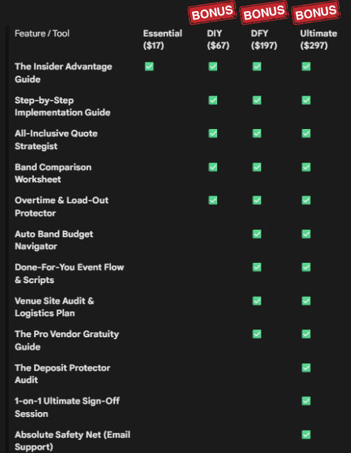 The only specialized resource is the Band Booking Navigator, our automated scoring tool. Because this tool is designed for the active phase where you are comparing live quotes, you get 30 days of unlimited access. This gives you a focused window to plug in your data, get your "MVP" results, and book with total confidence.
